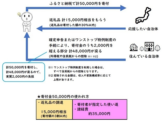 確定申告またはワンストップ特例制度の手続を行うことで、寄付額のうち2,000円を超える部分が所得税や住民税から控除されます。